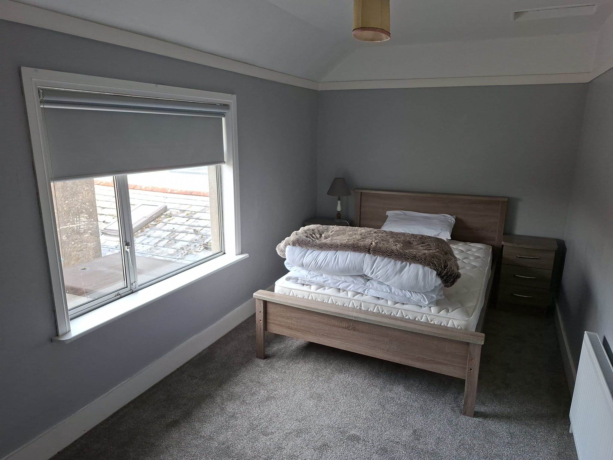 Bedroom 1 – Vinyl flooring; radiator; frosted window
