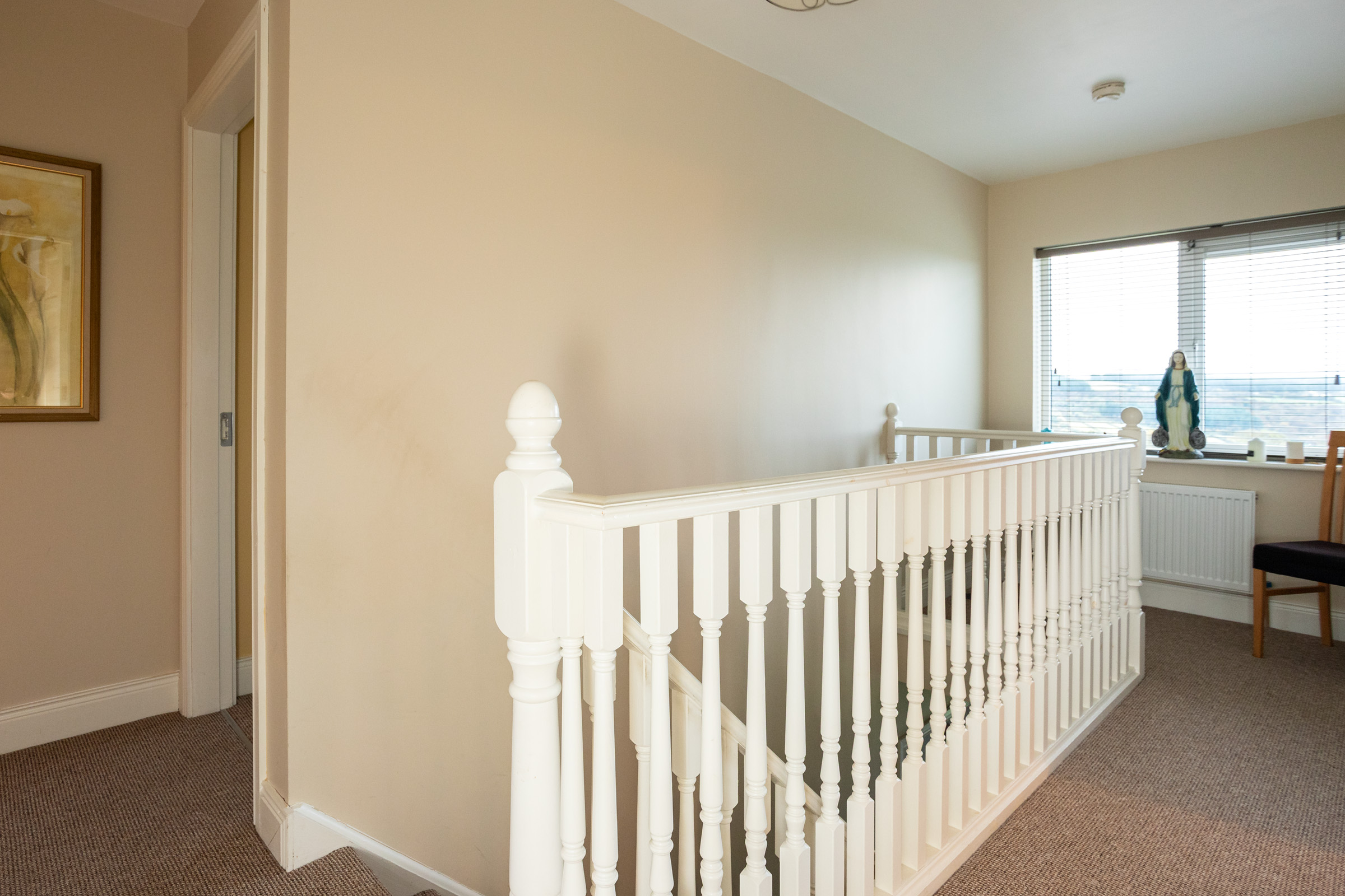 Stairs and Landing – Fully carpeted; south facing reading area; nice views; radiator; blinds; hot press