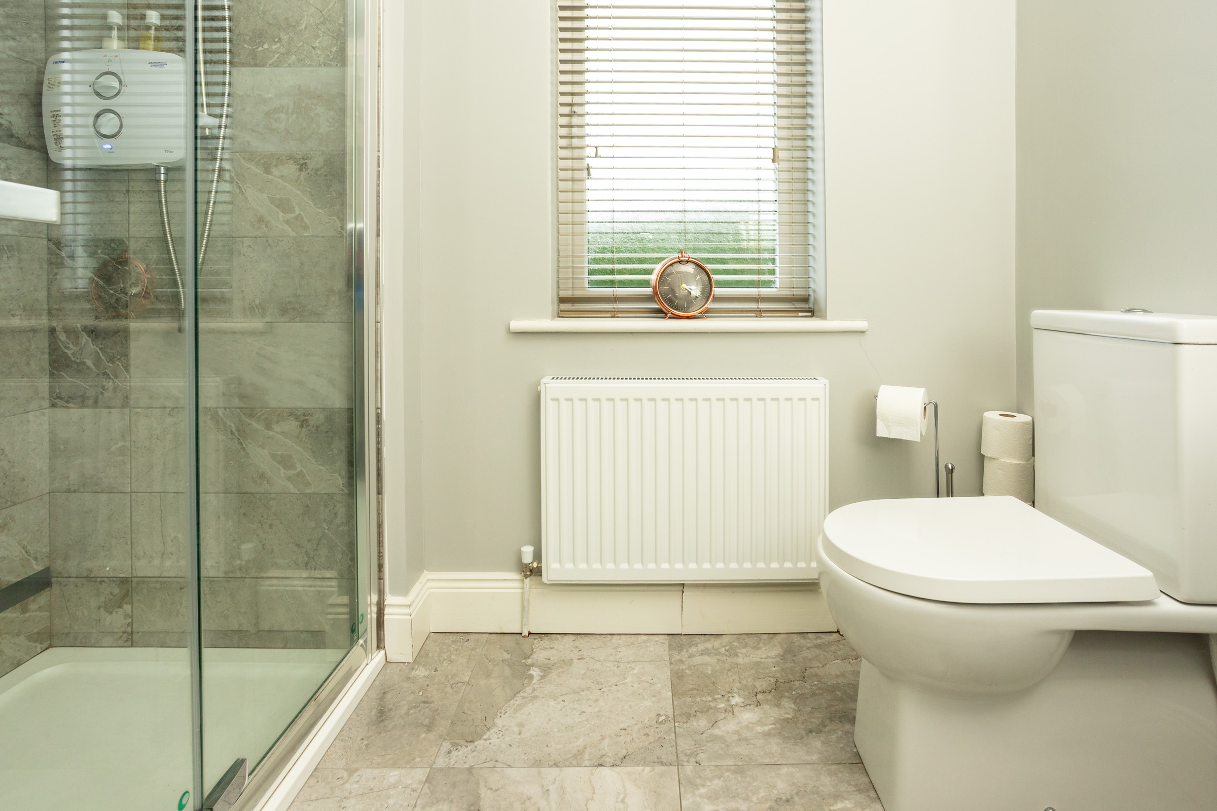 En Suite – Tiled floor; heated towel rail; white ware with medicine cabinet; window; plumbed for shower