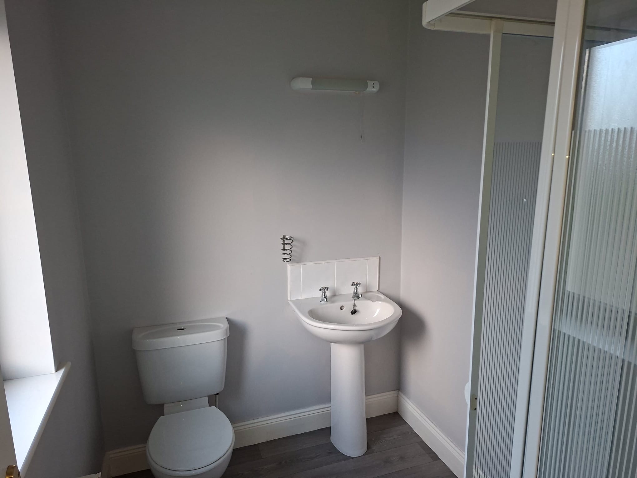 En Suite – Vinyl flooring; glazed window; white ware; radiator; stand in shower