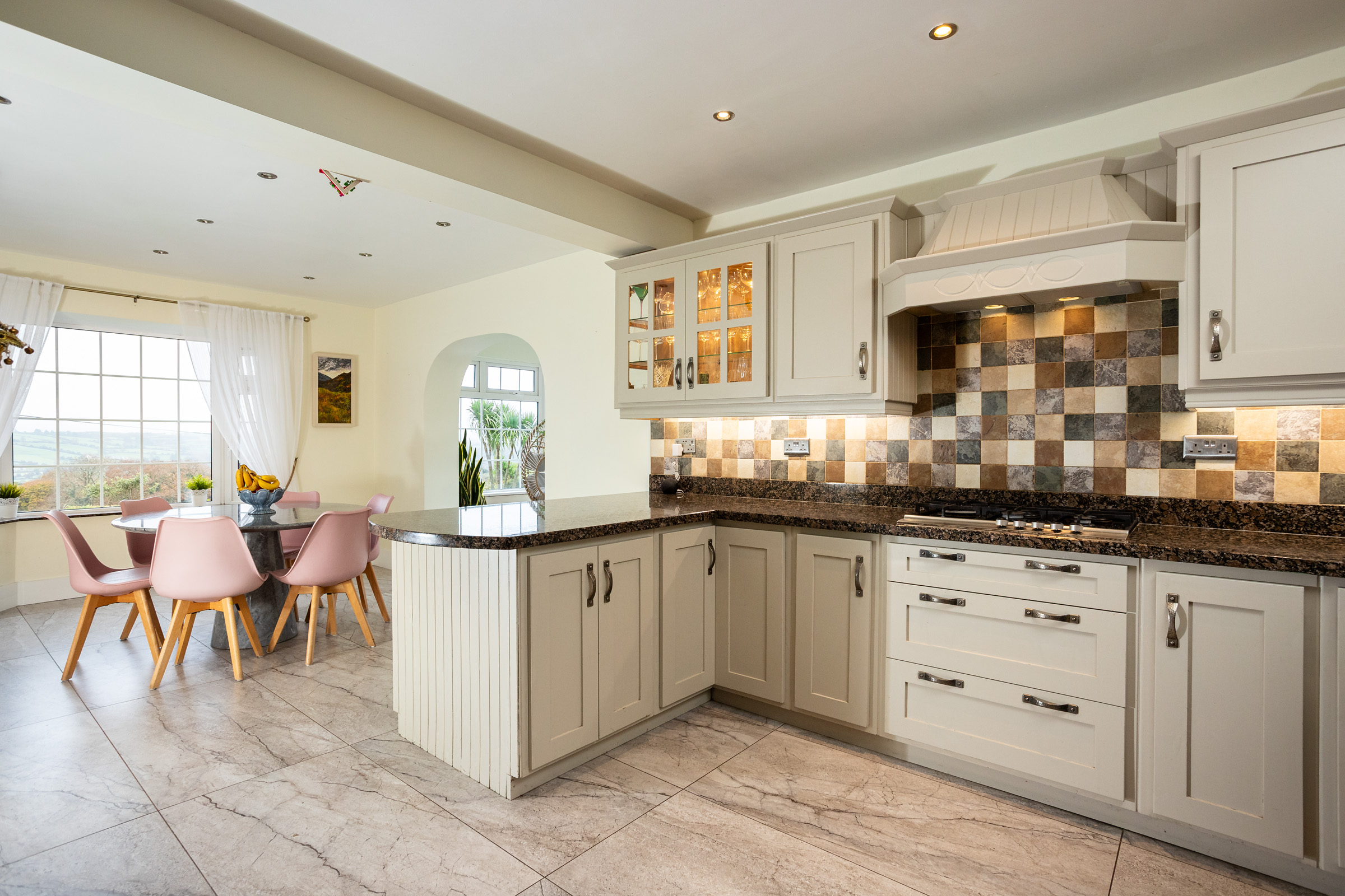 Kitchen / Dining Room – Tiled floor; dual aspect; bay window; blinds; extensive fitted kitchen; plumbed for fridge/freezer; granite worktop and breakfast bar; solid oak kitchen; part tiled walls; gas De Dietrich hob