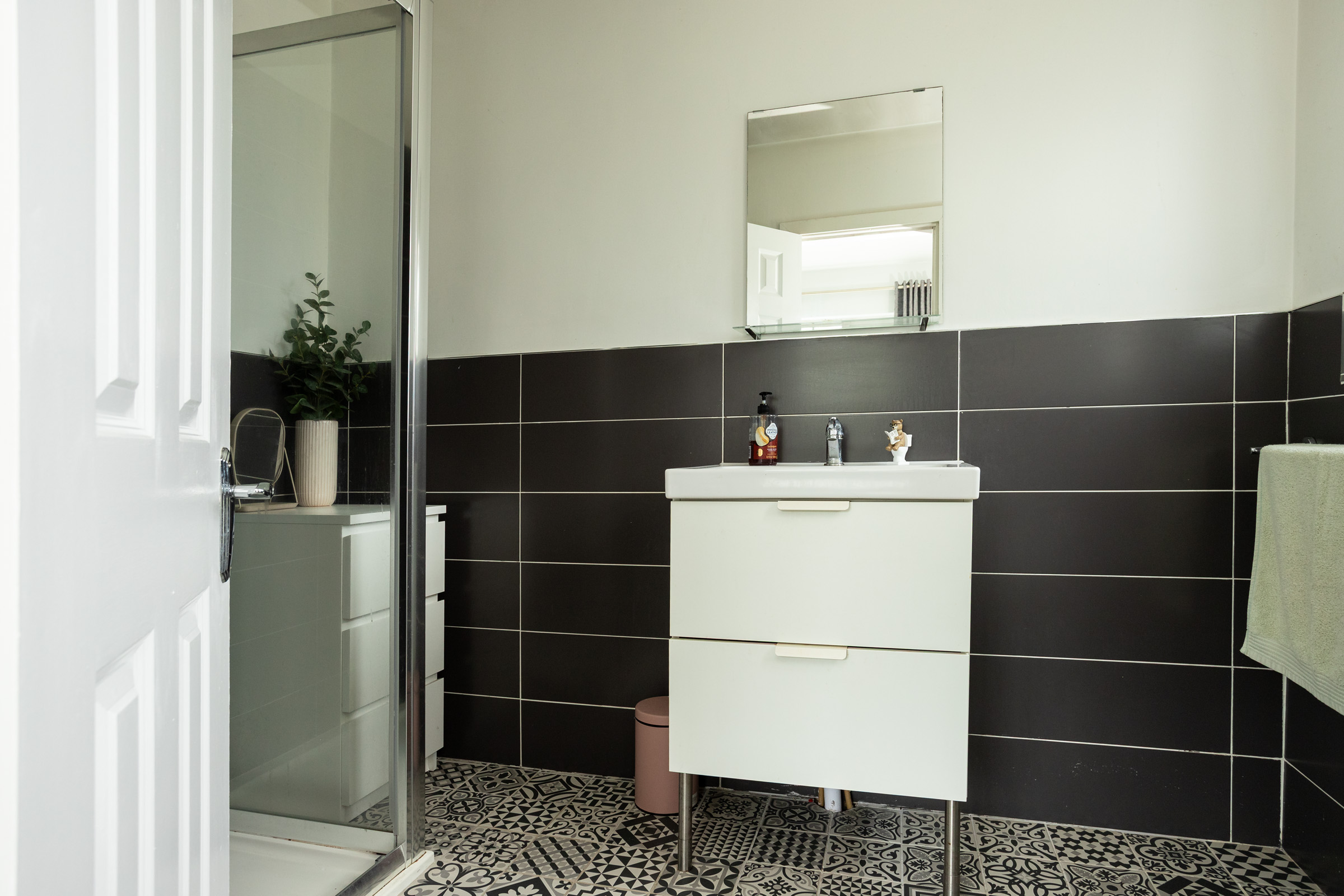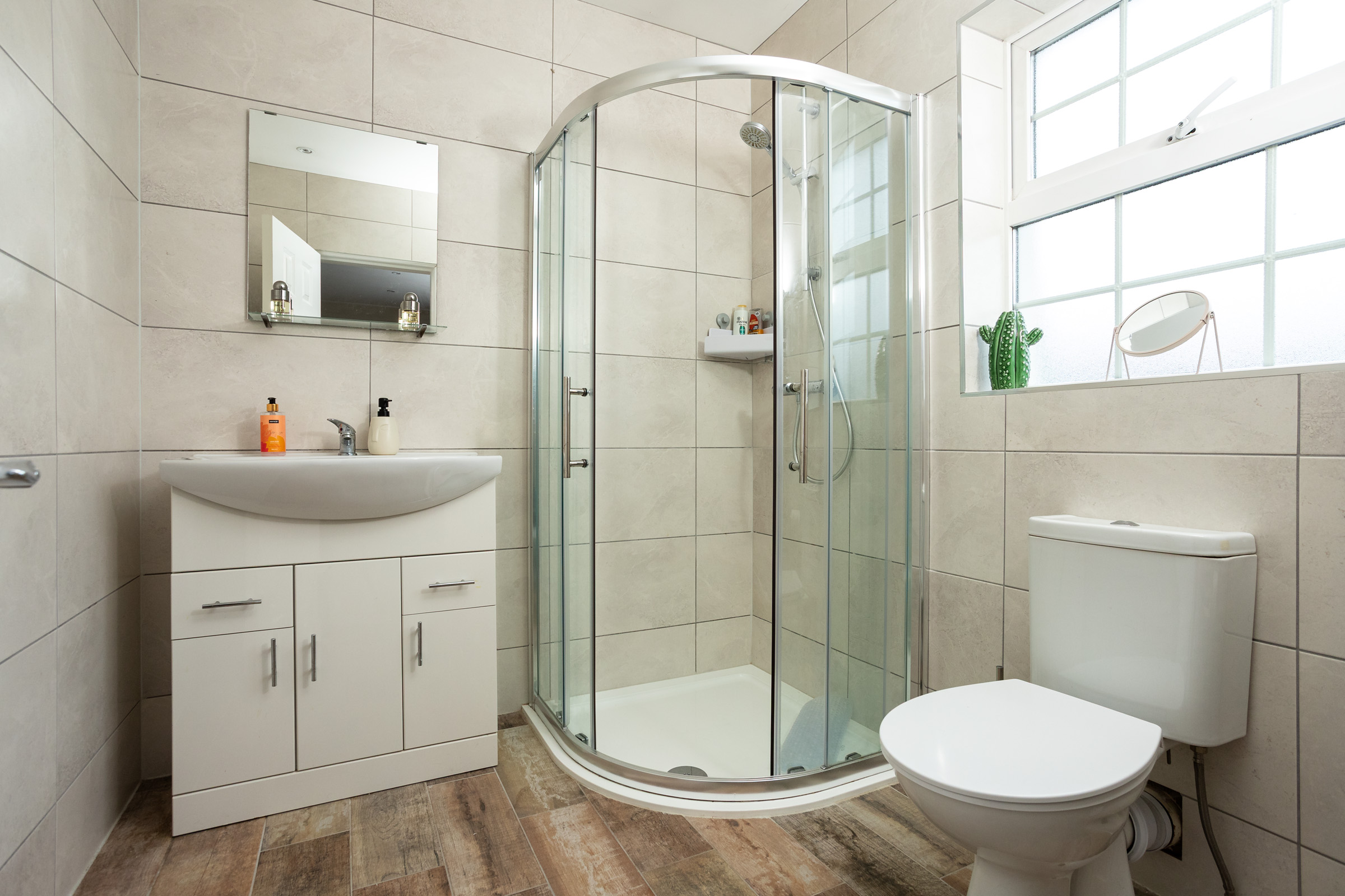 Bathroom – Wood effect tiled flooring; white ware; electric shower; medicine cabinet; radiator