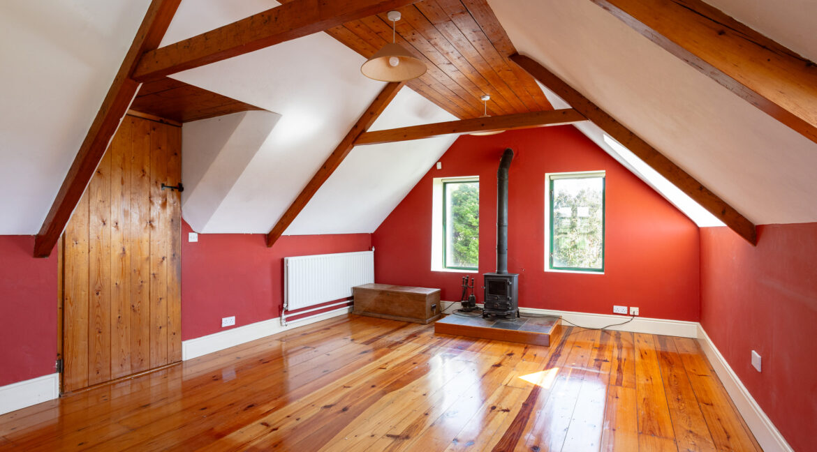 Timber floor; vaulted ceiling with exposed beams; solid fuel stove; 1 no glazed French door style window onto Juliet balcony; 2 no west facing triangular feature glazed windows; 2 no north facing glazed windows; solid wood door with traditional hardware; 2 no radiators