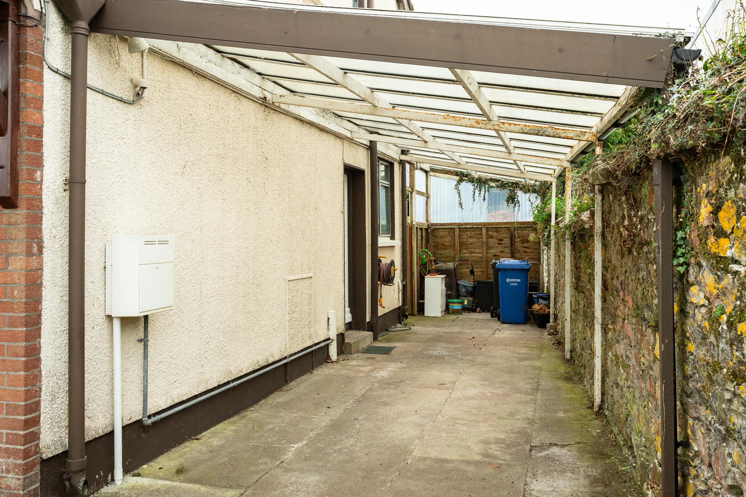Front Garden – Natural Stone & Block Boundaries, Tarmac drive, Kerbed lawn with Hedging, Large car port to Side with access to rear garden.