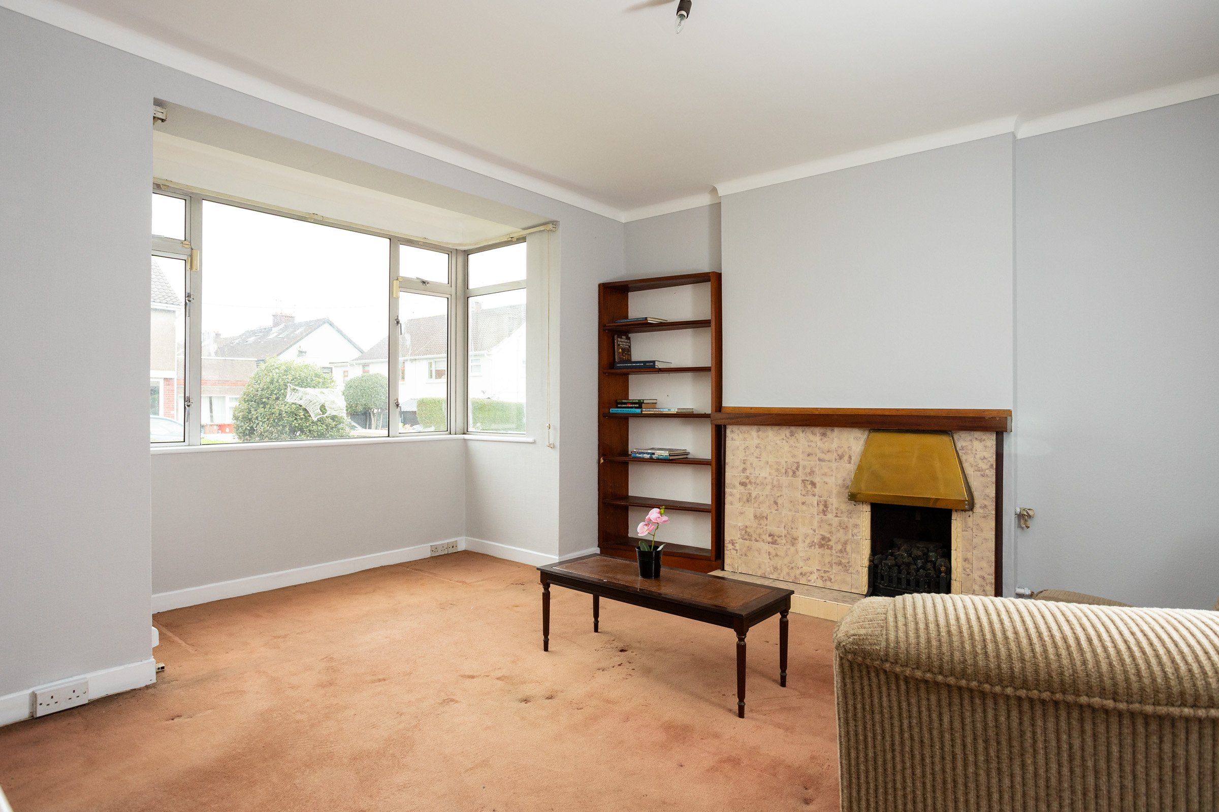 Sitting Room – Carpet, Fireplace with gas fire, Fitted Mahogany Alcove Unit, Radiator, Large Bay Window