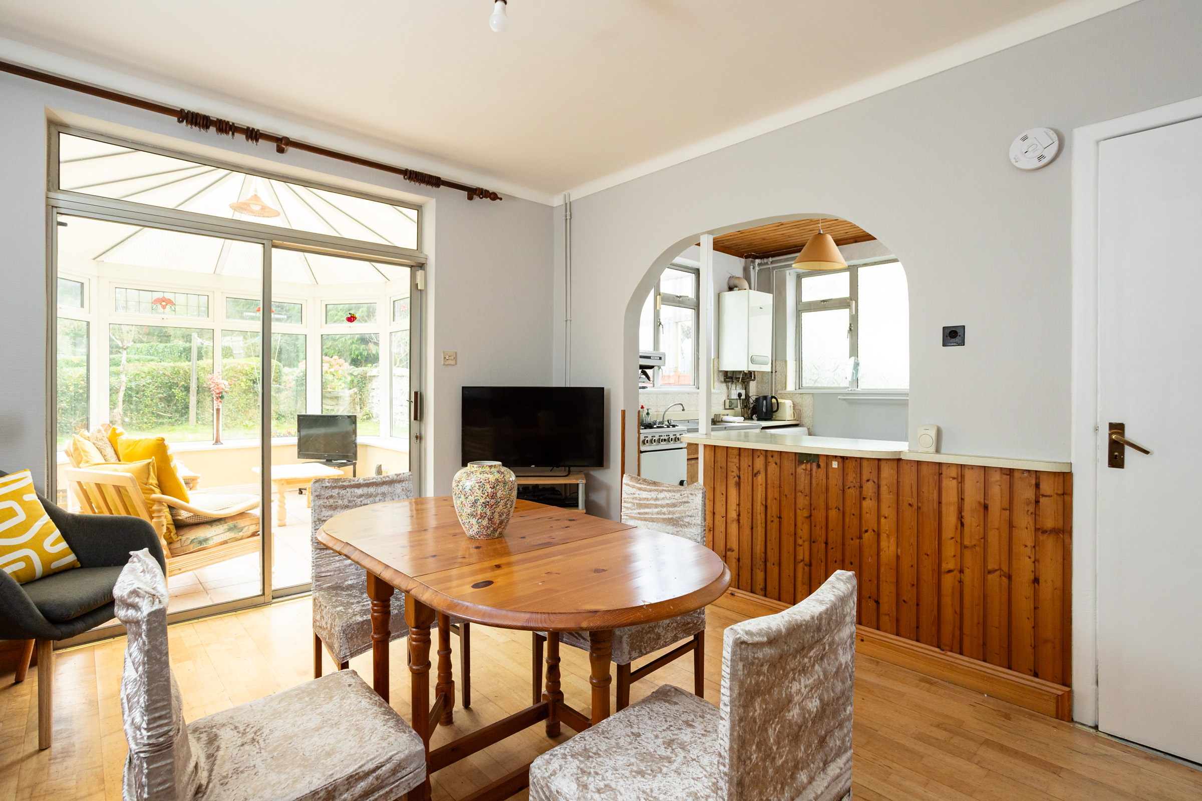 Kitchen/ Dining – Wooden and vinyl flooring, Brick Fireplace with brass Canopy, 3 No radiators, Patio door to sunroom, Fitted Units & Breakfast Bar, Part Tiled Walls