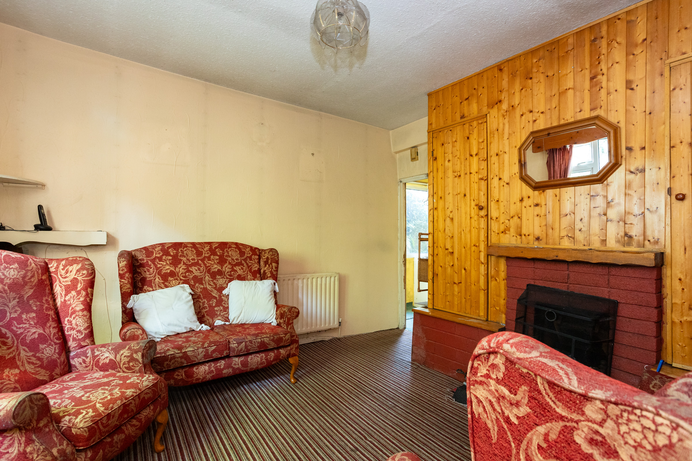 Sitting Room – Carpet; curtains; brick fireplace; radiator; fitted shelving; panelled walls