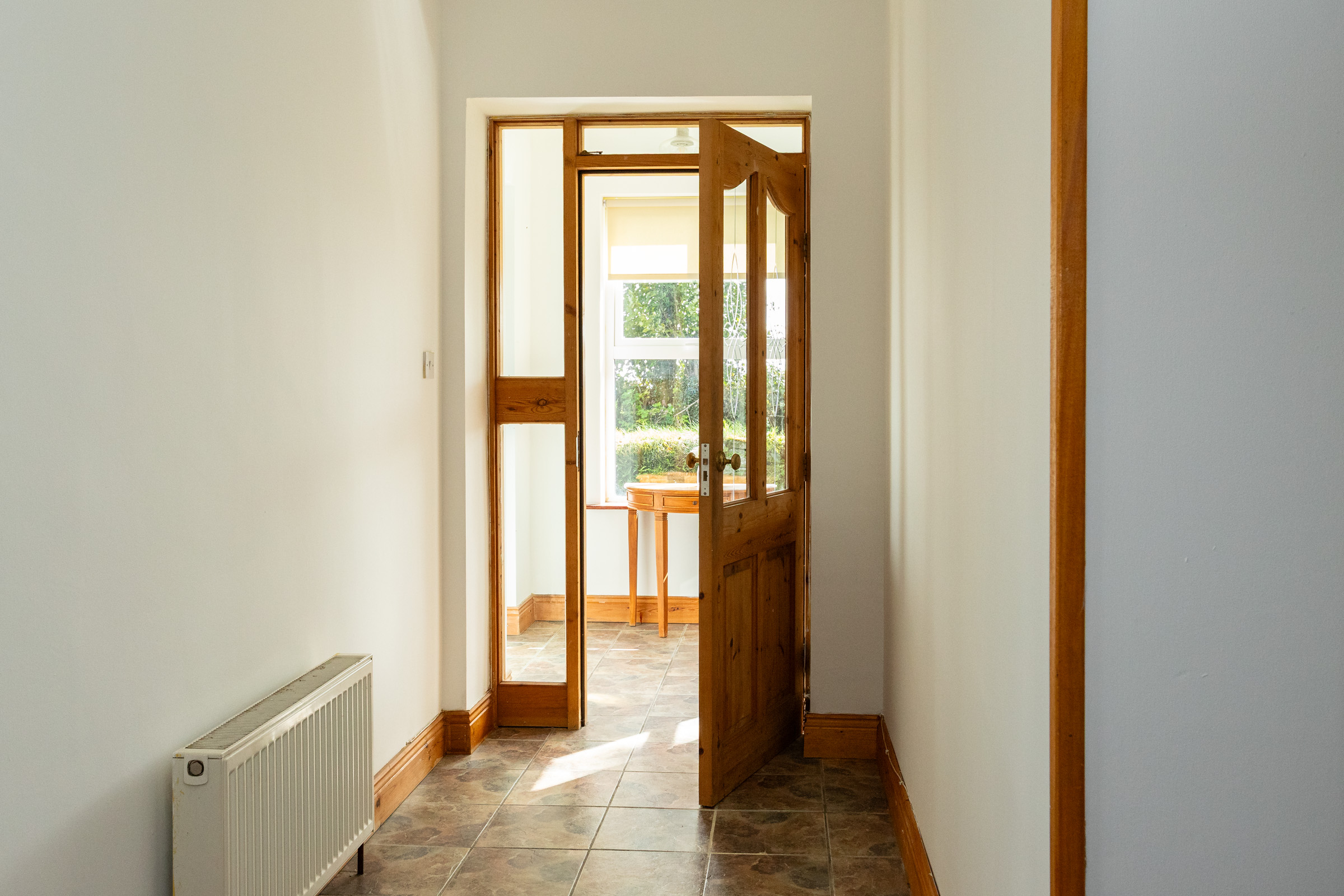 Hallway: Centrally located; tiled floor; radiator; glazed pine door; under stairs storage.