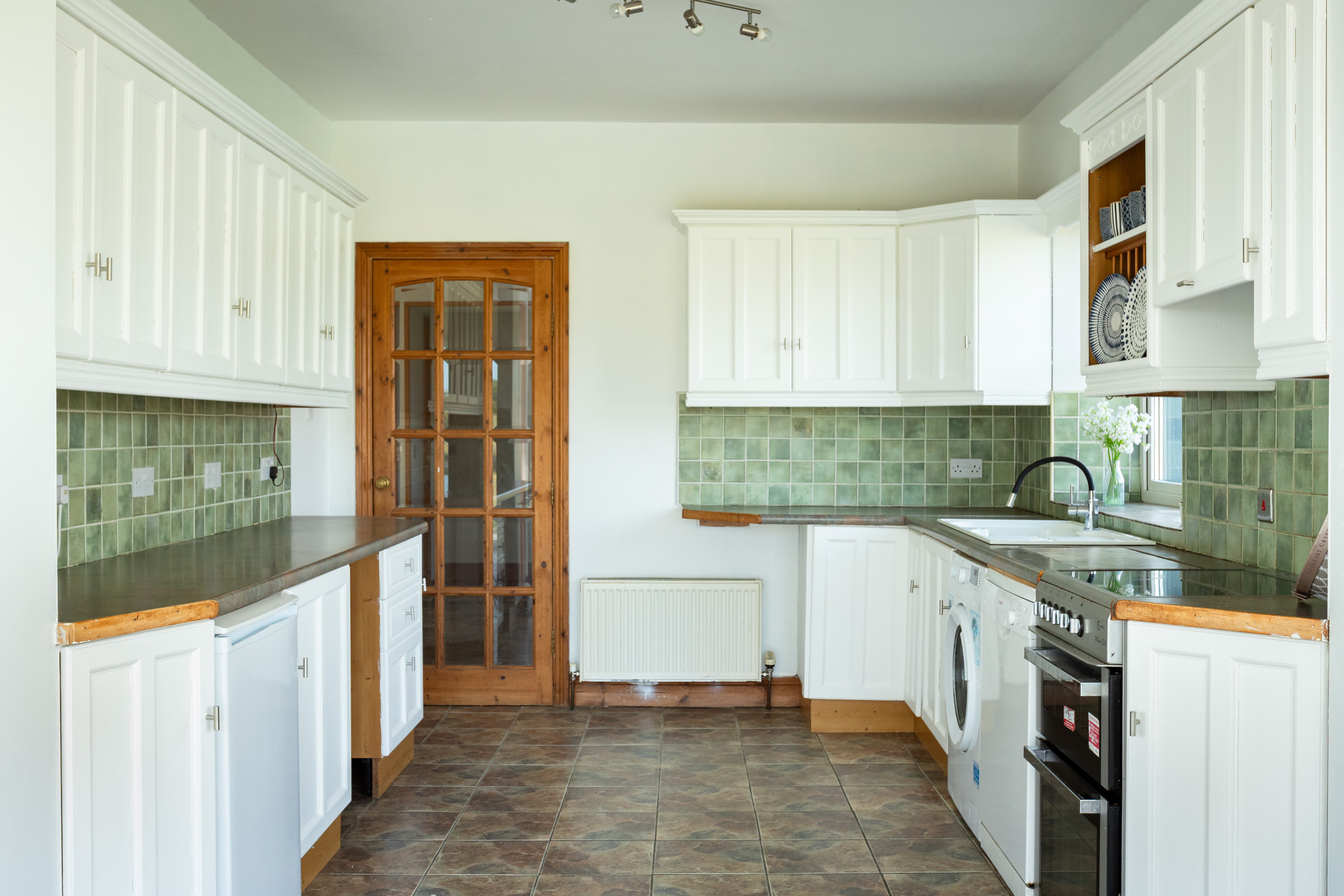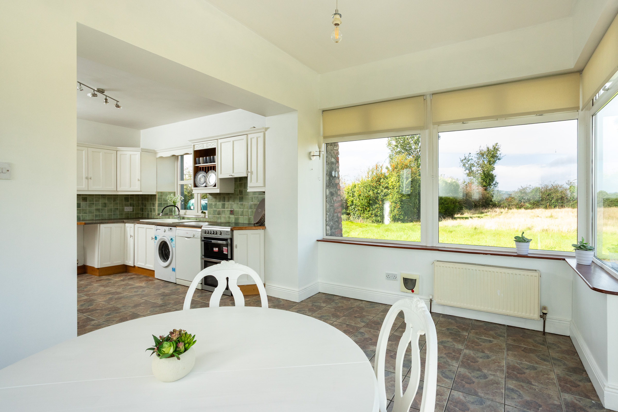 Kitchen / Dining: Triple aspect; very bright; tiled floor; fitted kitchen units; plumbed for dishwasher and washing machine; partially tiled walls; sliding door to patio; 2. No. radiators.